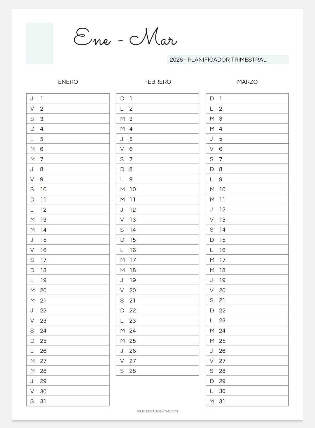 Ideal para agendar eventos/citas/examenes/etc. y poder visualizarlos en contexto (3 meses por página) y así organizarte de forma más consciente.